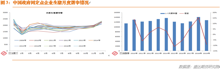 8月15日,中国农业农村部发布最新生猪和能繁母猪存栏数据:400个养猪县的数据显示,2019年7月份,中国生猪存栏环比下降9.4%、同比骤减32.2%;能繁母猪存栏环比下降8.9%、同比暴降31.9%。这将造成猪肉价格高点大约在明年上半年。因收益不佳+环保政策双重压力,2014年8月-2015年12月,据农业农村部数据,能繁母猪存栏连续17个月出现两位数以上同比降幅,造成2016年6月猪肉价格涨至峰值31.56元/公斤。而本次疫情造成的能繁母猪存栏同比大幅下降,预计持续至19年4季度。行业专家预计,生猪存栏有效恢复大致得在明年4季度,且中间不能再次出现疫情的大范围爆发!另外,值得关注的是:非洲猪瘟疫情自8月份正式公布,自18年8月至19年7月,定点企业生猪屠宰量小计20996万头,自17年8月至18年7月则为22235万头,也即同比下降9.39%。(某种程度上可视为需求下降幅度,2018年定点企业生猪屠宰总量占当年生猪出栏总量的34.95%。因此,我们维持前期的判断:定点企业生猪屠宰量可在相当程度上反映生猪需求情况。)2019年前7个月,定点企业生猪屠宰量小计12827万头,同比下降9.13%。数据显示,疫情并未导致恐慌性屠宰现像出现,猪肉供应降幅明显好于生猪存栏下降程度,这也是猪肉价格并未涨至市场预期程度的原因之一。