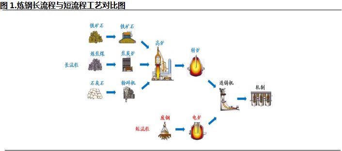 长流程和短流程是两种典型的钢铁冶炼工艺,其中高炉+转炉、电弧炉分别是长流程和短流程的核心设备。原料上,长流程采用铁矿石和冶金焦冶炼铁水;短流程采用废钢为主要原料。在经济成本上,电弧炉的建设成本较低,吨钢生产的边际成本较高。