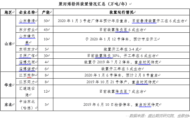 进入一月份以来,丙烯单体价格持续走强,导致粉料成本居高不下;而春节将至,下游工厂陆续放假停工,需求跟进乏力;部分地区粒料价格大幅下滑,粉粒料价差迅速缩小,粒料价格已经低于粉料;多重打击下的聚丙烯粉料企业生存再次陷入尴尬境地。首先我们先来看一下粉料上游丙烯的情况。从下图中可以看出,进入一月份以来,丙烯单体受原油大涨提振,价格涨势不止。我们知道,粉料产能多集中在小型的民营地炼当中,企业较多且分散,且产能较小,行业集中度低。受制于产品特性,粉料行业处境较为被动,自主调节能力差,其上游丙烯主要来源于外采,因此丙烯单体价格的波动对粉料的影响比较明显,丙烯价格走高后,粉料企业利润受到挤压,故企业为维持利润,价格顺势上调,蛋上调幅度不及丙烯,导致其利润不断受到压缩。我们可以看到,由于粉料利润持续受到挤压,叠加临近春节,部分装置已经停车或者降负荷运行。需求方面,临近年底,下游塑编工厂陆续停工或是降负生产,企业整体开工一般,且企业终端订单跟进不足,采购粉料力度减缓,因此需求面的拖累影响仍不容小觑,粉料受丙烯带动被调涨,但需求抑制下市场涨幅有限。我们再来关注一下粉粒料价差,从下图可以看出,从 2019 年 12 月份至今,粉粒料价格整体均呈现下跌走势,而 12 月中旬开始,粒料价格下调幅度较大,导致粉粒料价差不断减小,步入一月份以来,更是出现了粉料价格反超粒料价格的罕见行情。在这种情况下,一旦粉料比粒料便宜到 150 甚至 200 以内,制品工厂会比较倾向用粒料,不仅环保而且浪费少,性价比高一点。