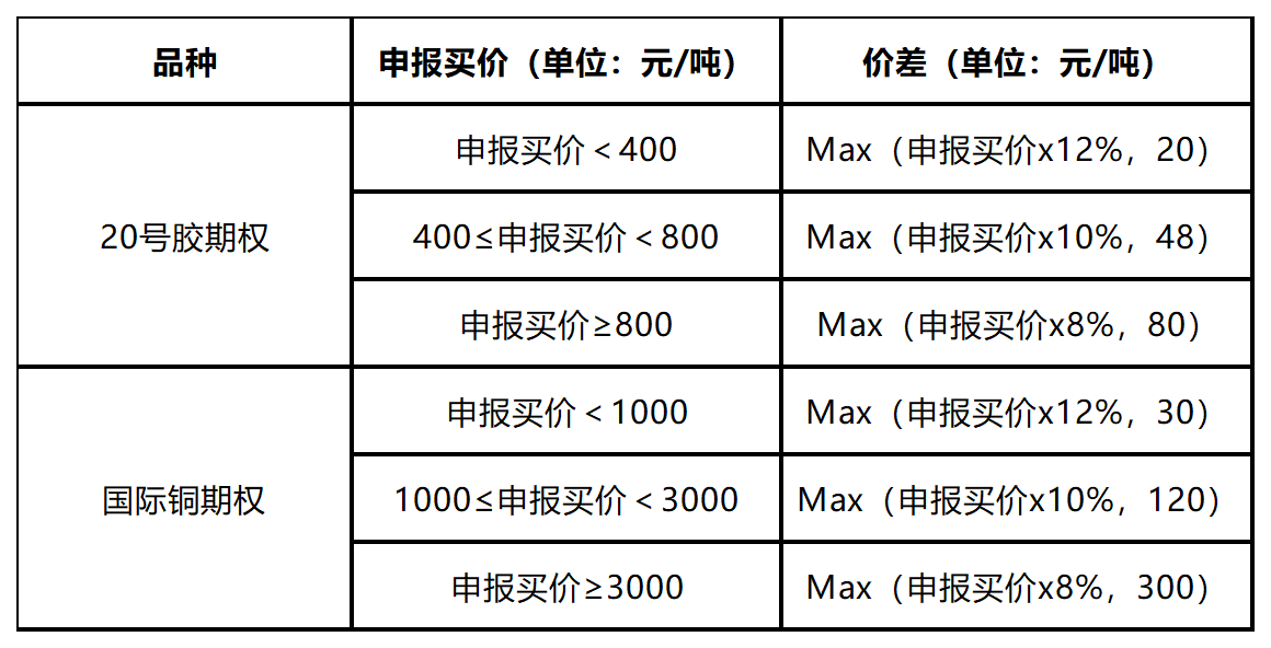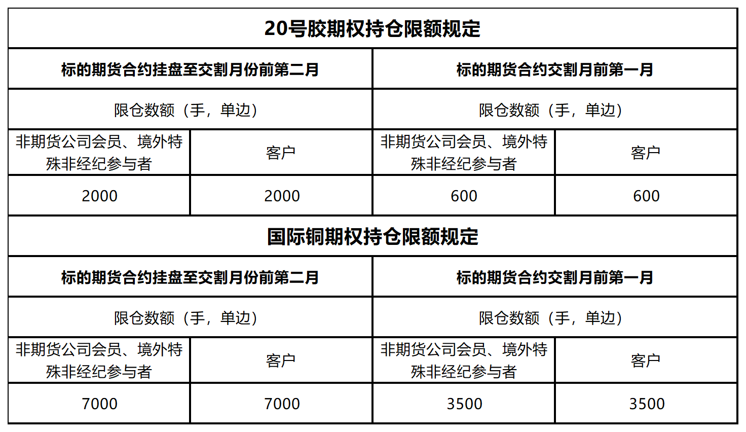 20号胶期权合约月份涉及的标的期货持仓量阈值为10000手(单边);国际铜期权合约月份涉及的标的期货持仓量阈值为5000手(单边)。