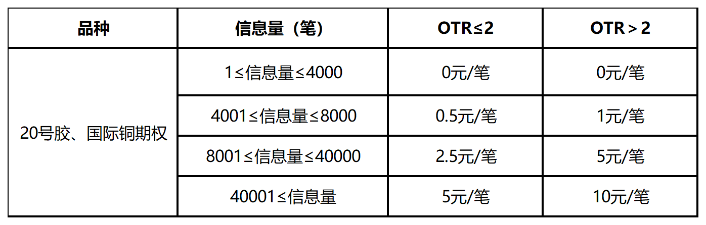 20号胶、国际铜期权对客户信息量收取申报费,各品种收取标准一致,如下表所示。