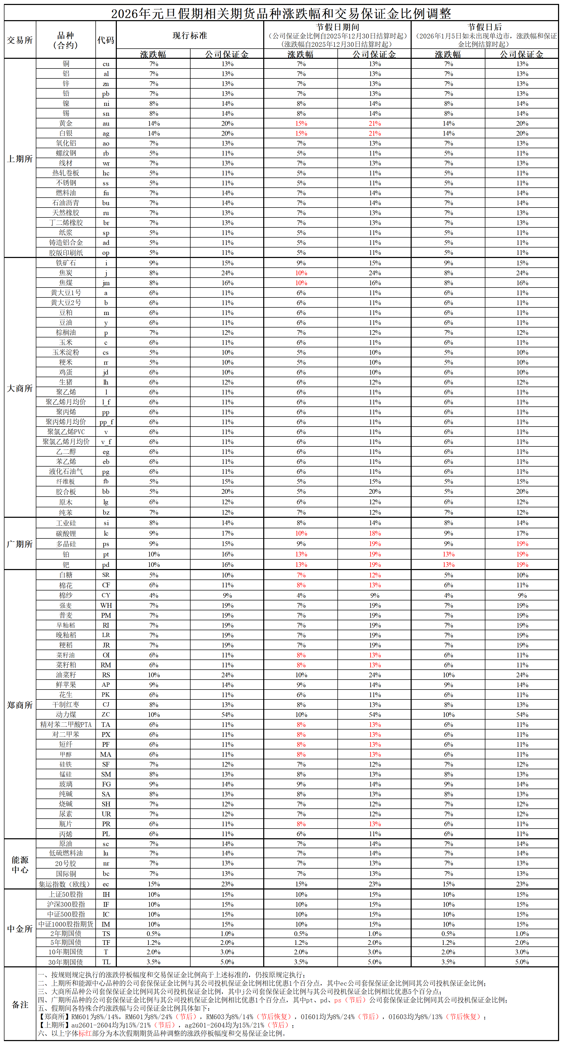 关于2026年元旦假期调整相关品种期货合约涨跌停板幅度和交易保证金标准的通知