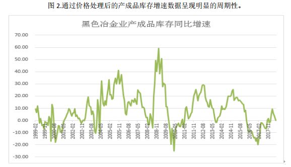 在宏观的维度上,国家统计局发布的黑色金属冶炼及压延加工业:产成品存货是观测钢铁行业整体库存的重要指标。产成品库存指标是一个金额指标而非数量指标,它包含了产成品存货数量和价格两个因素,这使得该指标不能直接对产成品库存做一个准确的描述。我们将存货同比数据做一个简单的去除价格波动的处理:LN(产成品存货)=LN(产成品库存*产成品价格)=LN(产成品库存)+LN(产成品价格);对存货数据求同比增长可以分解成:产成品库存同比增速=产成品存货同比增速-产成品价格同比增速。通过上述计算方法得到如下图2所示的产成品库存数量同比增速。