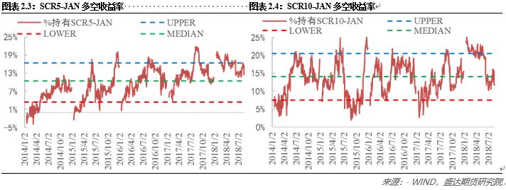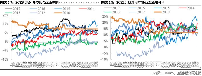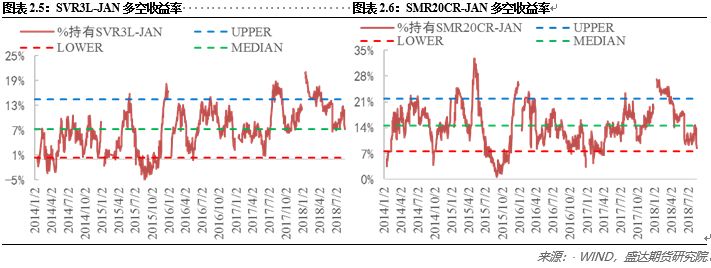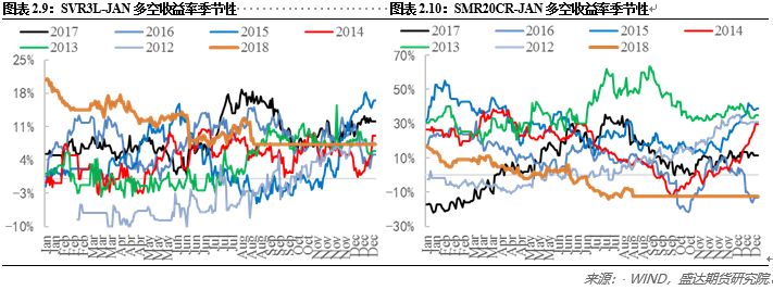 具体来看,现货全乳老胶(SCR5)、标二胶(SCR10)、越南3L(SVR3L)和马混(SMR20CR)分别对沪胶1月合约的多现货空期货的收益率相对过去两年来说目前已经明显缩小,再结合历年收益率的季节性走势来看,后期收益率继续缩小的空间也相对有限,且目前JAN-MAY期差处于正常水平,展期收益也不大,因而很难吸引新的期现套利资金入场,除非是短期基本面发生重大变化而刺激1月合约大幅拉涨,使得期现套利收益重新回升至较高水平而吸引新的套利资金入场,但是在目前基本面并未看到任何实质性有效的利多和大量期现套利资金紧盯盘面的情况下,期现收益率很难大幅走高。