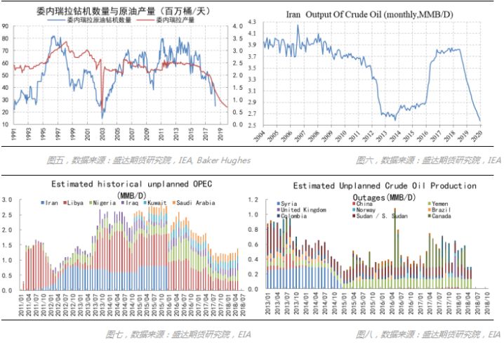 相比需求的稳定增长,供给端总是问题不断,委内瑞拉原油产量因投资不足导致的持续下滑以及伊朗原油产量后期受美国制裁亦将出现大幅下滑。首先,我们来看一下委内瑞拉的原油产量,如图五所示,委内瑞拉原油产量自2015年以来随着原油钻机数量的减少持续减少,今年开始下滑加速。原油钻机数量(上游投资)决定了未来委内瑞拉的产量,基于投资的减少预计未来委内瑞拉原油产量将以每季度10%的速度下滑,预计今年年底将下滑至100万桶/天,较当前损失30万桶/天。