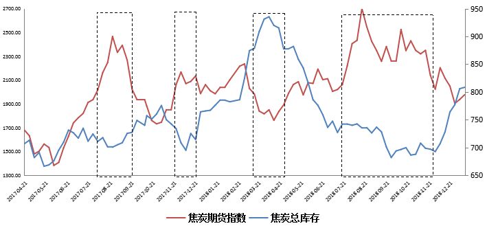 焦炭三个环节的总库存与焦炭期货价格呈现反向关系。 总库存增加则期货价格下跌;总库存减少则期货价格上涨。库存的增减反映供需结构的动态变化,焦炭期货价格基本符合供需影响价格的经济学定律。