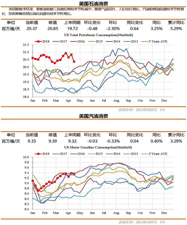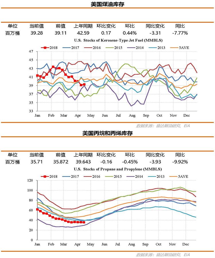 截至4月20日当周美国原油库存受美国原油产量的增长以及炼厂开工下滑的影响,意外增加217万桶。美国石油库存受美国产品净出口的增加,小幅增加65.2万桶。俄克拉荷马州库欣地区原油库存增加45.9万桶,受二叠纪与库欣地区价差的持续扩大(库欣-米兰德价差已至6美元/桶)以及库欣至美湾管道运力有限的影响,预计后期库欣地区库存仍将继续增长。汽油库存录得增加84万桶,后期随着消费的回升预计汽油库存将减少;精炼油库存录得减少261.1万桶,煤油库存增加17.2万桶。预计后期随着美国汽油消费和煤油消费季节性增长,美国石油库存将进入季节性去库存阶段。