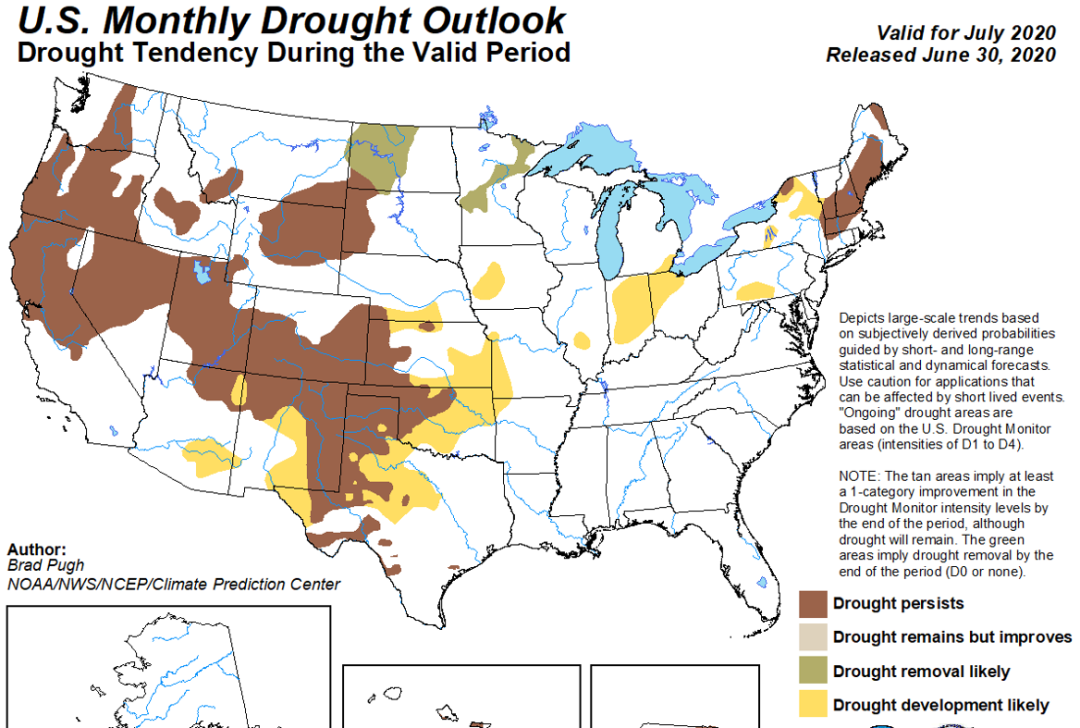 虽然上周,美国部分区域有降水,但是目前看降水并不充分。而且,最新预报,7月份美国的干旱区域将扩大。未来2到3天玉米带的东部地区将出现适度降水,之后转为干燥。未来6-10天仍会有一些雨水出现,但雨量不大,预计主要覆盖明尼苏达,威斯康星和密苏里北部。整体来看,这个7月可能是玉米带自2012年气温最高的7月,6-10日和8-14日都显示中西部大部分地区气温高于正常而降水低于正常水平。