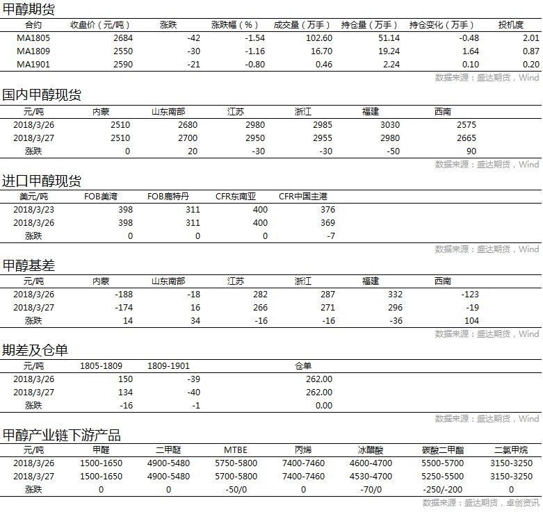 盘面上,主力合MA1805日内低开下行,震荡下滑,收于2784元/吨,下跌42元/吨,持仓量减少0.48万手至51.14万手。