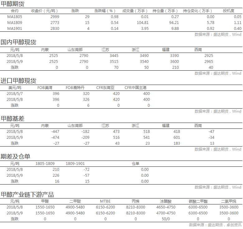 盘面上,主力合约MA1809日内低开高走,宽幅震荡,收于2773元/吨,上涨15元/吨,持仓量增加5.78万手至94.21万手。