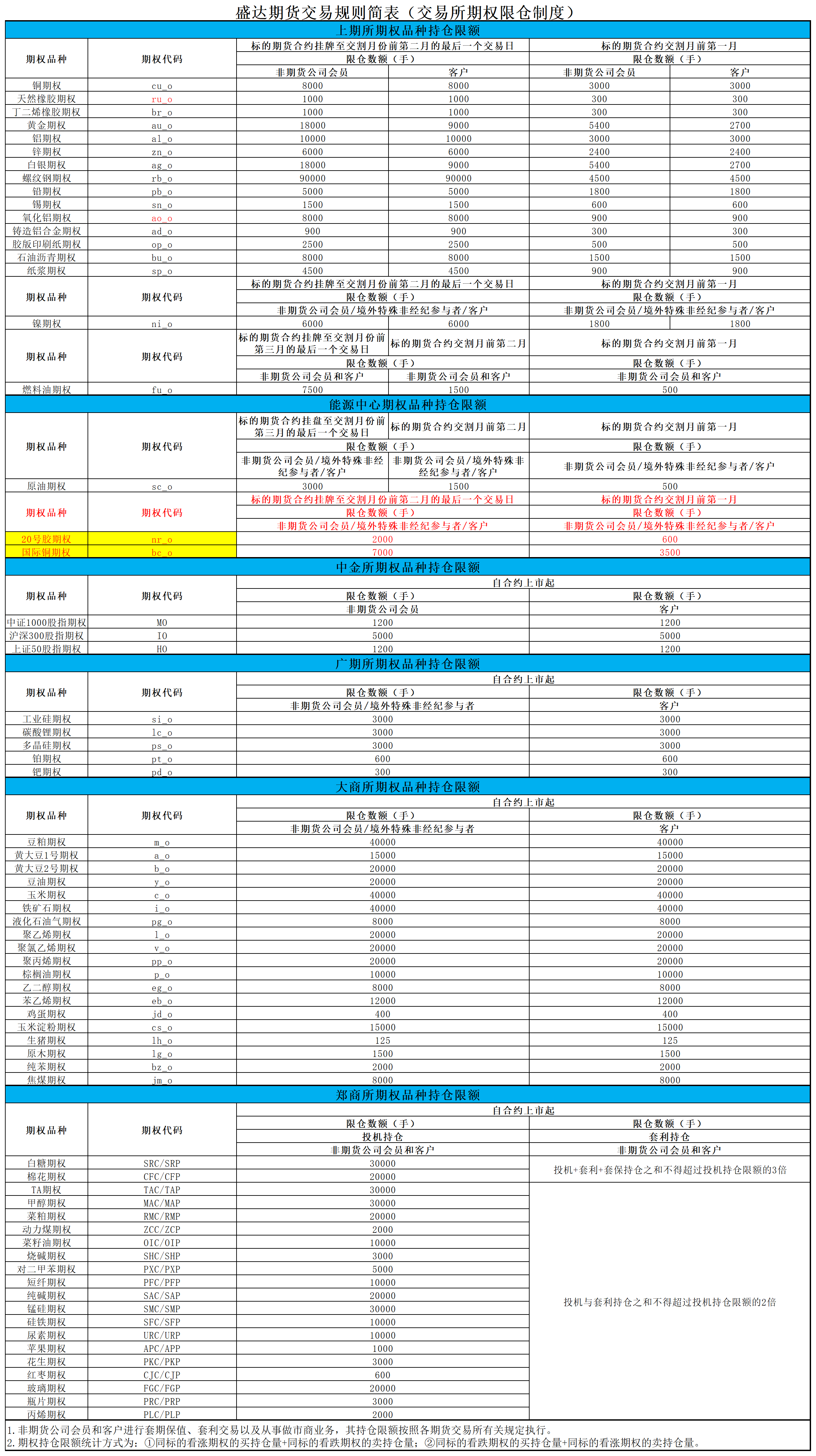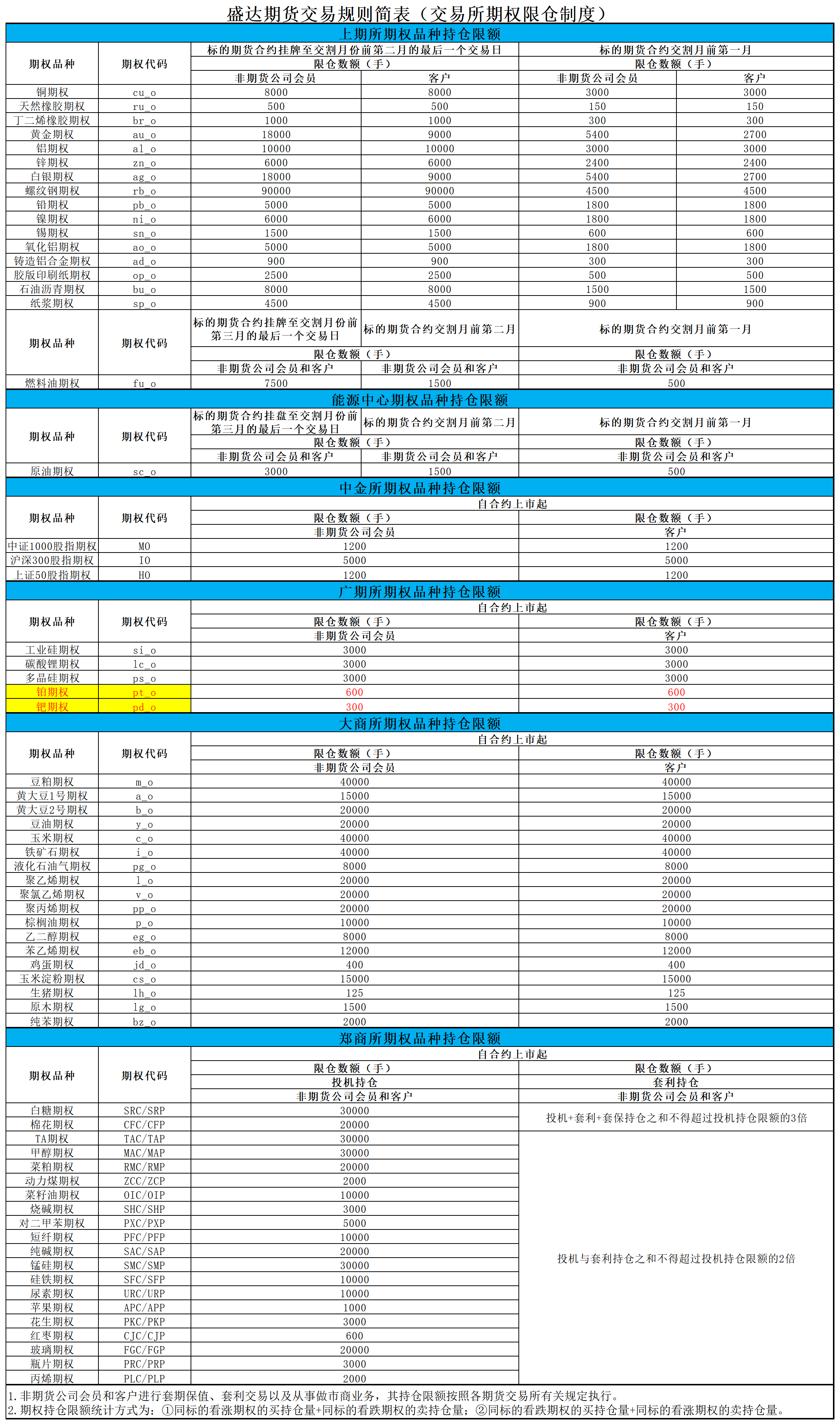 盛达期货交易规则简表(期权持仓限额规则)