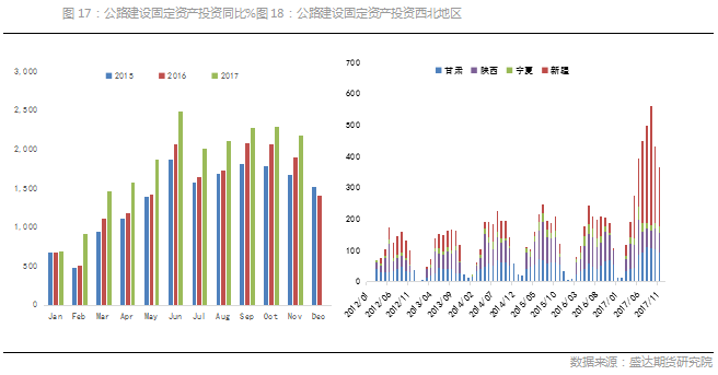公路建设主要跟踪交通固定资产投资(公路建设)的月度情况。2017年1-11月全国公路建设投资累计金额19833亿元,同比去年增加21%,其中西部贡献主要增幅,也符合国家布局中西部开发的战略安排,其中新疆同比去年增加4倍以上,同时由于物流原因西北区域(以新疆为代表)的沥青现货价格往往对其他区域升水,而新疆明年的基建落实预期也十分强烈。