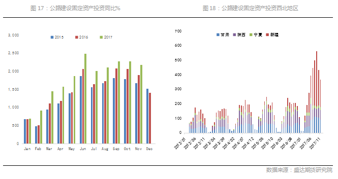 公路建设主要跟踪交通固定资产投资(公路建设)的月度情况。2017年1-11月全国公路建设投资累计金额19833亿元,同比去年增加21%,其中西部贡献主要增幅,也符合国家布局中西部开发的战略安排,其中新疆同比去年增加4倍以上,同时由于物流原因西北区域(以新疆为代表)的沥青现货价格往往对其他区域升水,而新疆明年的基建落实预期也十分强烈。