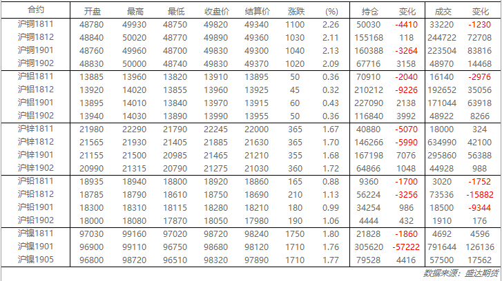 今日收盘沪铜主力报收于49830元,涨幅2.13%;沪铝主力报收于13970元,涨幅0.43%;沪锌主力报收于21465元,涨幅1.68%;沪镍主力报收于98680元,涨幅1.76%。