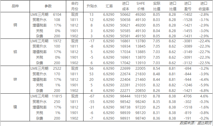 沪锌:本月国内锌精矿加工费和进口锌精矿加工费均大幅回升,国内锌精矿供应已经得到明显改善,并且国外锌精矿已经运至国内,锌精矿供应或将进一步增加;加工费的走高也大幅改善了炼厂的加工利润,也将刺激冶炼厂产量释放;本月锌锭进口盈利窗口再次关闭,进口亏损幅度走扩,后期进口量或将明显放缓;今年前三季度国内锌锭下游各板块消费明显放缓,10月份国内交易所和三地社会锌锭库存均出现回升,11月国内锌市将进入消费淡季,需求端也将难有表现,后期锌价仍将继续承压下行,建议沪锌1812合约在22250—22750元/吨区间逢高沽空,突破23400元/吨止损,目标位19500—20000元/吨。