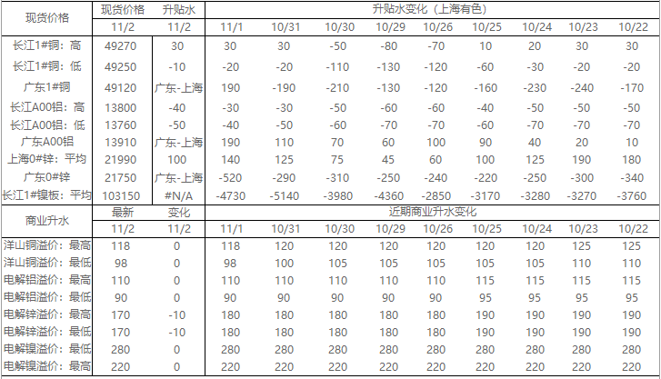 从现货来看,今日长江1#铜升水30元/吨至49270元/吨;上海0#现锌升水100元/吨至21990元/吨;长江A00铝贴水40元/吨至13800元/吨。