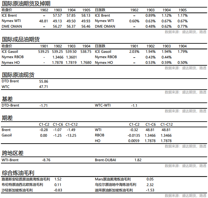 短期价格展望:中国降准和美联储的态度松动刺激市场情绪,布伦特可能向上试探60-65一线。中长期价格展望:目前市场对于2019年经济状况在逐渐形成一致性的悲观预期,美联储调整缩表计划实质上是验证美国经济增速拐点,悲观预期并没有反转,布伦特在50附近运行可能成为常态。