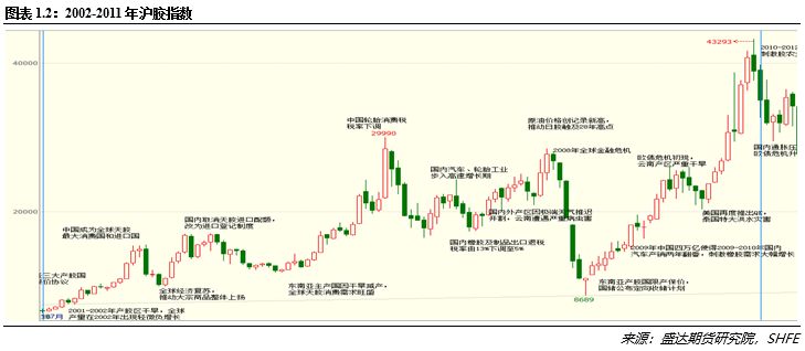 第二时期是2002年年初到2011年年初的震荡上涨,期间沪胶指数从6336元/吨最高上涨至43293元/吨,涨幅高达583%。具体来看,在2002年上半年,长期低迷的胶价迫使东南亚三大产胶国达成保价协议和产胶区出现干旱(全球产量在2002年出现轻微负增长)成为了胶价开启长期上涨之路的导火索。而随着全球经济复苏,我国在2003年成为全球天胶最大的消费国和进口国,并先后取消了天胶进口配额而改为进口登记制度、下调了轮胎消费税税率和国内橡胶及制品出口退税税率,使得国内汽车和轮胎工业步入了高速增长期,强劲的需求推升天胶大幅上涨。期间东南亚主产国的极端天气和国内遭遇的病虫害以及2008年原油价格创记录高点也对天胶价格起到了一定的推动作用;但是在2008年下半年由于全球金融危机,沪胶指数连续下挫,在触碰最低价8689元/吨(相对前期高点29990元/吨下跌71%)后才出现企稳,而在东南亚产胶国限产保价和国储公布定向收储计划后,天胶再次开启上涨之路,2009年的中国四万亿使得2009-2010年国内汽车产销两年翻番,刺激橡胶需求大幅增长,另外泰国特大洪水灾害以及国内产区严重干旱也对橡胶价格上涨提到了推波助澜的作用。由于2009-2011年的橡胶价格的持续大涨,高利润刺激了2010-2012年主产国天胶新增种植面积大幅增加,在2011年2月份沪胶指数见顶。