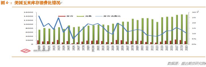 在供应有所增加同时需求调增的情况下,期末库存也大幅下降,18/19美国玉米年终库存较月预估数下调2500万蒲,减至15.52亿蒲,处于2014/15年度以来的最低位,库存消费比降至10.52%!按照历史规律,如此水准的库存/消费比,在执行再生燃油标准(PFS)以来,7月中旬的美玉米12月合约价格从未出现在3.95美元/蒲之下!