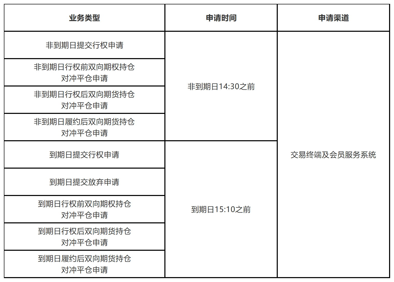 20号胶、国际铜期权均为美式期权,客户办理行权、放弃行权等业务的时间及渠道见下表。