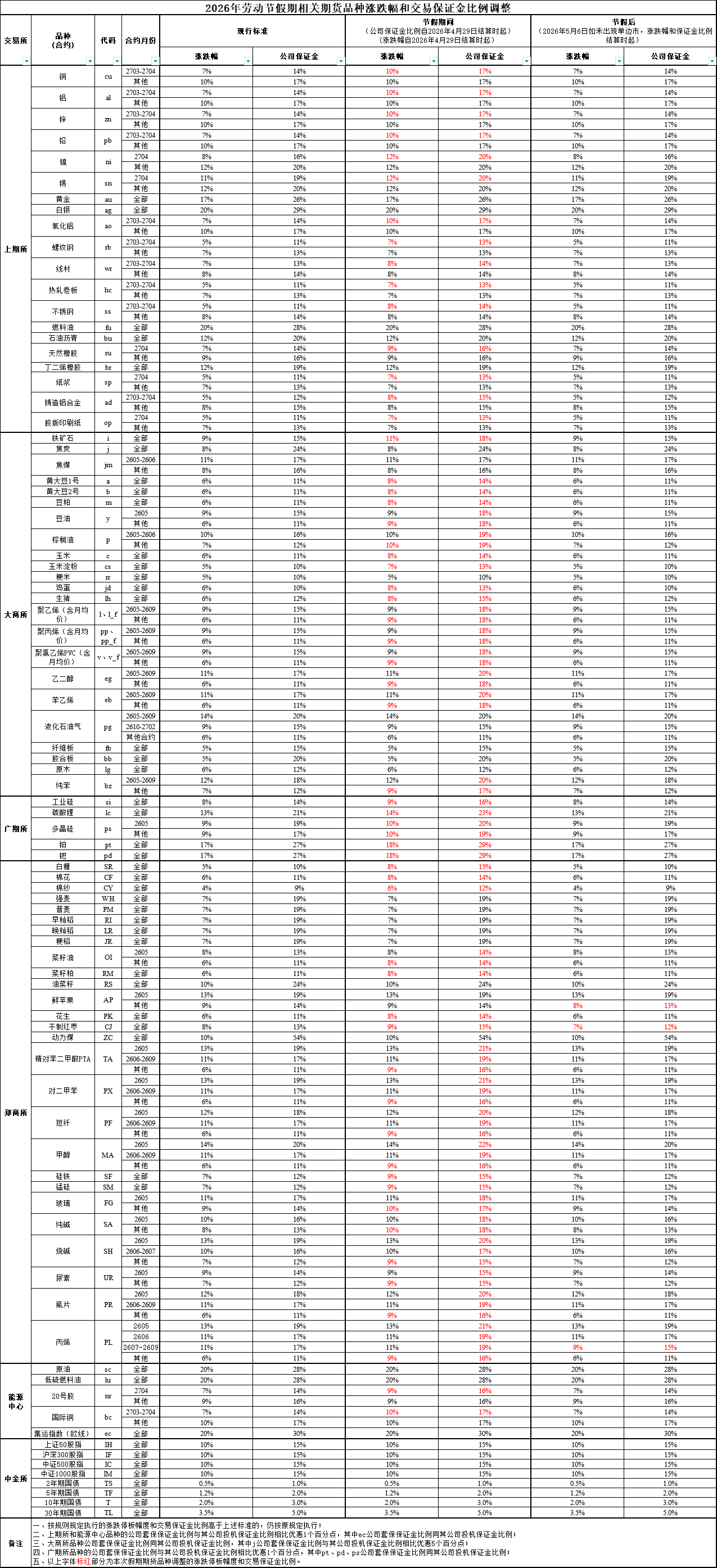 关于2026年劳动节假期调整相关品种期货合约涨跌停板幅度和交易保证金标准的通知