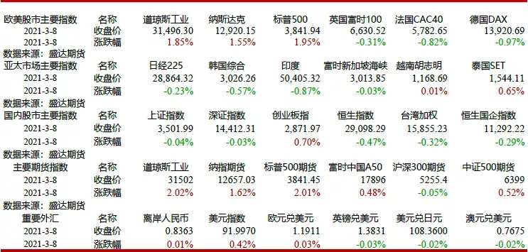 股市方面美股道指隔夜收盘于31496.3点,涨跌幅为1.85%,纳斯达克隔夜收盘于12920.15点,涨跌幅为1.55%,标普500隔夜收盘于3841.94点,涨跌幅为1.95%。英国富实100隔夜收盘于6630.52点,涨跌幅为-0.31%,法国CAC40隔夜收盘于5782.65点,涨跌幅为-0.82%,德国DAX隔夜收盘于13920.69点,涨跌幅为-0.97%。日经225昨日收盘于28864.32点,涨跌幅为-0.23%,韩国综合昨日收盘于3026.26点,涨跌幅为-0.57%,印度SENSEX30昨日收盘于50405.32点,涨跌幅为-0.87%。新加坡富时海峡昨日收盘于3013.85点,涨跌幅为-0.03%,越南胡志明指数昨日收盘于1168.69点,涨跌幅为0.01%,泰国SET指数昨日收盘于1544.11点,涨跌幅为0.65%。上证指数昨日收盘于3501.99点,涨跌幅为-0.04%,深证指数昨日收盘于14412.31点,涨跌幅为-0.03%,创业板指昨日收盘于2871.97点,涨跌幅为0.7%,。恒生指数昨日收盘于29098.29点,涨跌幅为-0.47%,台湾加权指数昨日收盘于15855.23点,涨跌幅为-0.32%,恒生国企指数昨日收盘于11292.22点,涨跌幅为-0.29%。期货方面,截至发稿,道指期货当前为31502点,涨跌幅为2.02%,纳指期货当前为12657.03点,涨跌幅为1.62%,标普500期货当前为3841.45点,涨跌幅为2.01%。富时中国A50当前为17896点,涨跌幅为0.48%,沪深300期货当前为5255.4点,涨跌幅为-0.05%,中证500期货当前为6399点,涨跌幅为0.52%。外汇方面,离岸人民币截至当前最新价格为0.8363元,涨跌幅为0.012%,美元指数最新为91.997点,涨跌幅为0.4183%,欧元兑美元最新价当前最新价为1.1911点,涨跌幅为0.026%,英镑兑美元最新价为1.3831点,涨跌幅为-0.0347%,美元兑日元最新价为108.36点,涨跌幅为-0.0203%,澳元兑美元最新价为0.7675点,涨跌幅为-0.0208%。