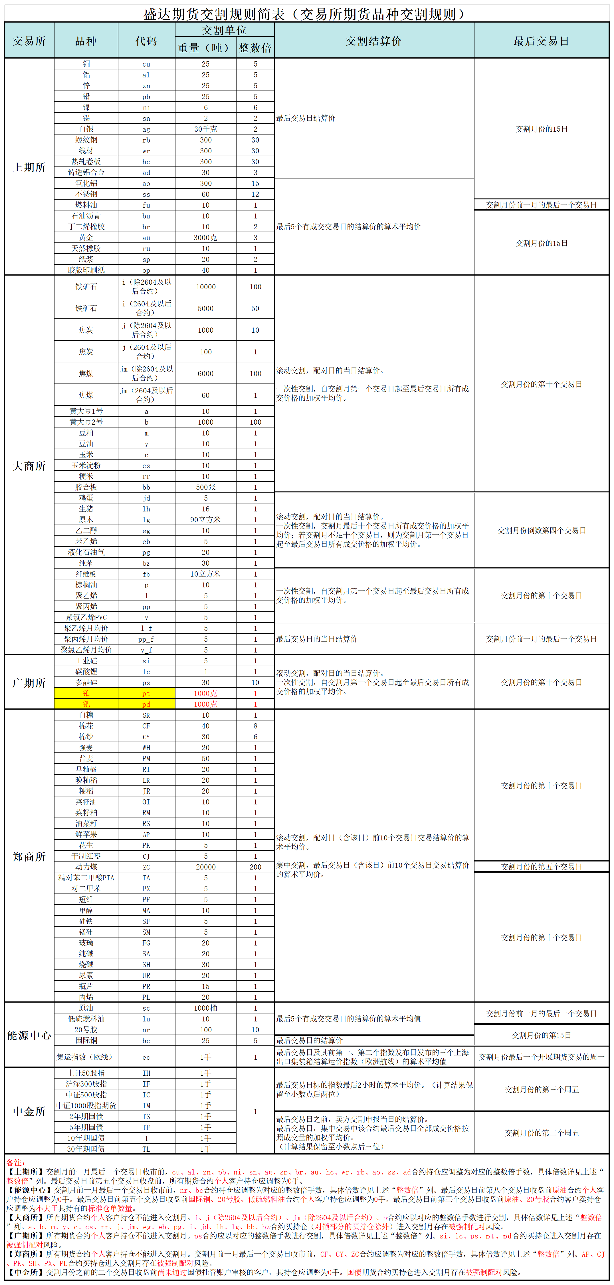 盛达期货交易规则简表(交割规则)