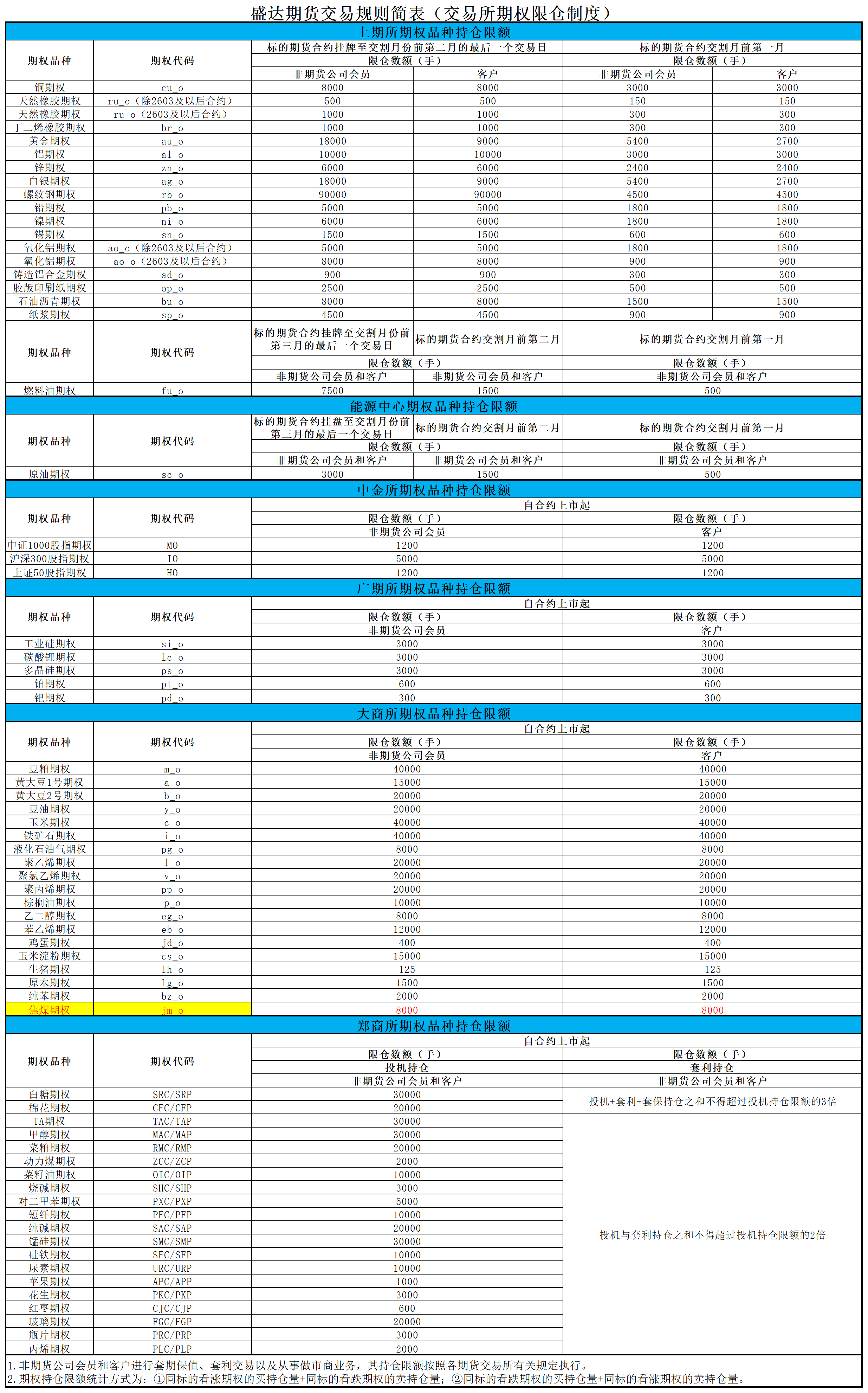 盛达期货交易规则简表(期权持仓限额规则)