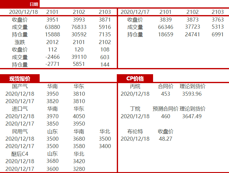 主力合约收盘价:3954;涨跌幅:涨123/3.51%;成交量:63880;持仓:15888手,日减仓2771手;仓单量:昨日6759,今日6759,增减0;现货市场(华南码头):3950-3980,今日华南码头成交纷纷推涨,进口成本大涨,以及供需方面的利好,拉升市场重心,市场心态逐步好转。主营炼厂低库存运行,今日也出现超预期上涨,推涨行情下,下游多有备货,今日市场购销氛围活跃,码头也出现了惜售,加重市场恐涨情绪,周末期间码头仍有上行预期。主流数据采集码头为:华凯、九丰、华基库(原新华昌)、港建、珠海新海、珠海龙华等。/span>