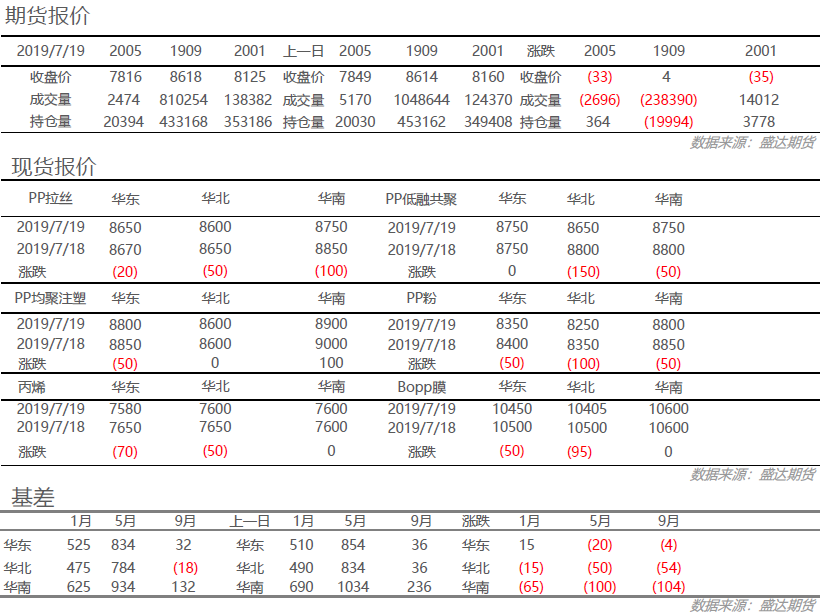 丙烯:今日丙烯市场价格重心小幅补跌,山东丙烯市场主流成交7580-7650元/吨。随着丙烯价格持续大跌,下游产品利润回升,对原料采购刚需放量,市场成交情况略有好转;粒料:今日国内PP市场多数弱调,幅度在50-100元/吨。期货上午小幅走高,午后回归低位震荡,压制市场情绪。原油价格持续下跌,加之石化多数下调出厂价,成本端支撑松动,进一步拖累现货价格;粉料:聚丙烯期货行情震荡,拖累市场信心,加之丙烯单体弱势调整,粉料价格小幅下调,山东地区主流成交在8300-8350元/吨,市场低价货源逐渐增多。