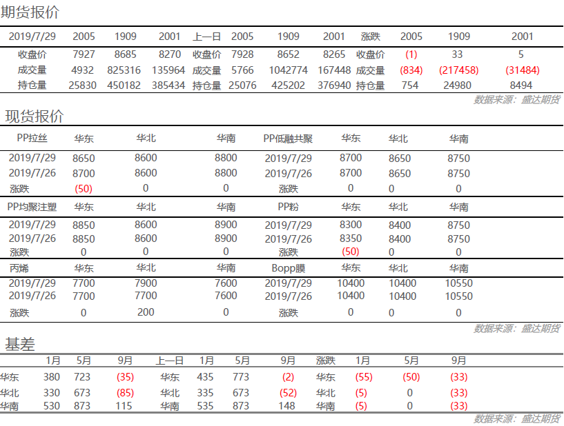 丙烯:今日丙烯市场价格弱势整理,市场观望情绪浓厚,炼厂报盘普遍以稳为主;粒料:今日国内PP市场价格小幅调整,涨幅在50元/吨左右,期货区间震荡,对现货提振有限;下游工厂按需采购,成交少;粉料:今日粉料价格稳中下调,上游丙烯单体高位运行,粉料成本面受压,现货消化不畅,且与粒料价差较小,库存压力大。