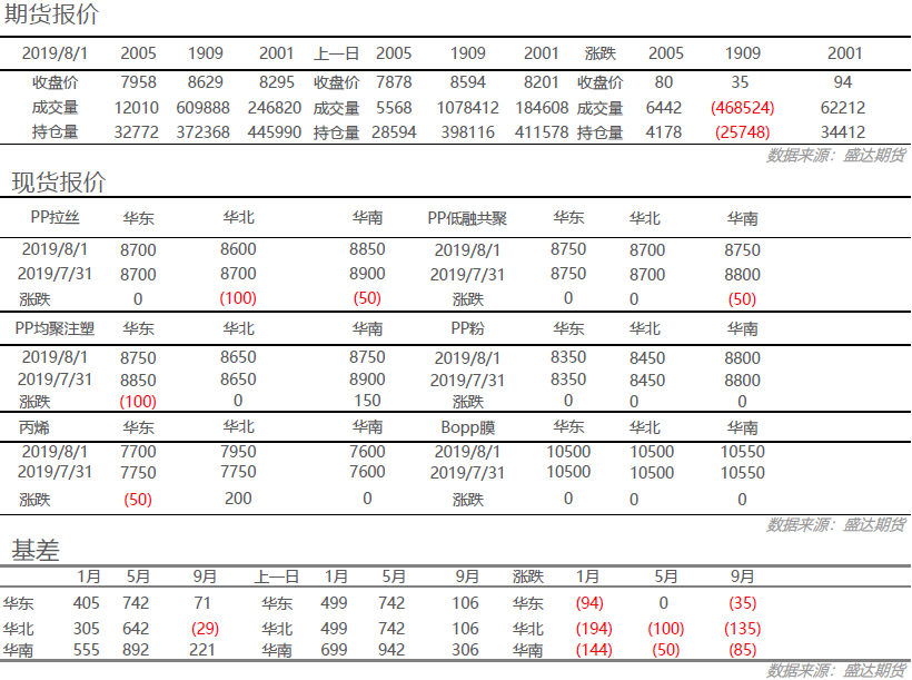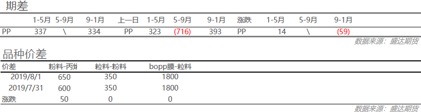 丙烯:今日丙烯市场价格维稳为主,聚丙烯期货、现货价格走低,利空业者心态,目前丙烯处于消息面博弈状态;粒料:今日国内PP市场价格窄幅震荡,消息面提振有限,盘面延续弱势震荡走势,石化月初部分价格上调,对市场影响有限,盘面开始主力换月;粉料:上游丙烯单体价格企稳盘整,加之近日粉料出货不畅,厂家排库出货意向增强,今日粉料价格小幅下滑;