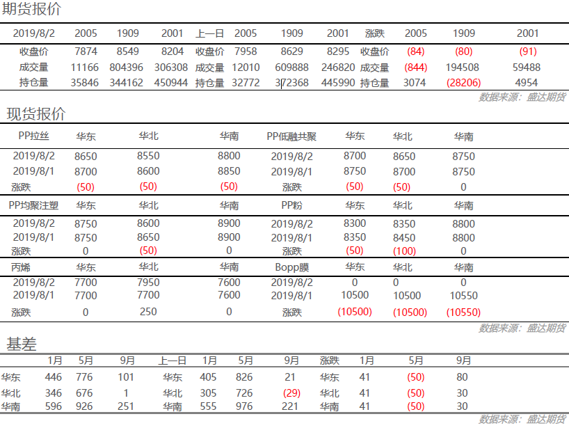 丙烯:今日丙烯市场价格弱势运行,国际原油暴跌,聚丙烯盘面价格走低,多重利空影梭导致丙烯市场交投气氛转淡;粒料:今日国内PP市场价格偏弱整理,受宏观面中美贸易关系影响,原油暴跌,成本端支撑松动,盘面价格处于低位震荡运行,市场观望情绪浓厚;粉料:聚丙烯行情不佳,加之国际原油暴跌,业者心态不佳,粉料价格下滑较为明显。