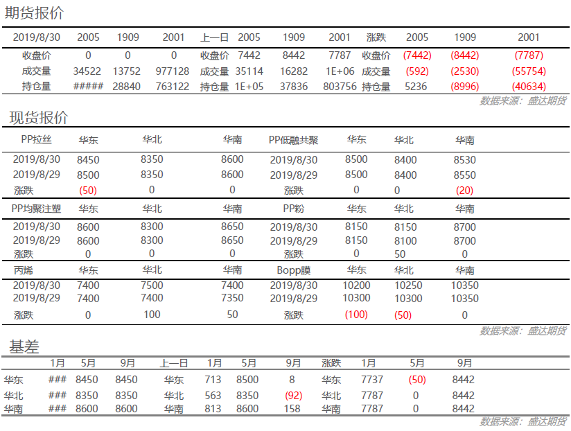 丙烯:今日丙烯市场价格涨幅扩大, 隔夜原油大涨,利好丙烯市场,下游买盘积极性提高,丙烯生产企业挺价明显。粒料:今日国内PP市场小幅整理为主,幅度在30-50元/吨,今日期货翻红对现货市场存在支撑,库存处于近两月低位,需求表现一般。粉料:聚丙烯期货行情上探, 丙烯单体上涨,粉料价格重心小幅上移。