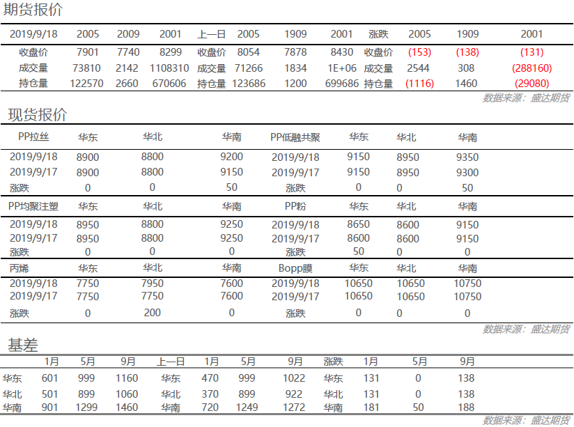 丙烯:今日丙烯市场价格维稳运行,国际原油价格暴跌,聚丙烯期货走势同步回落,利空市场心态,然当前丙烯市场供需基本面良好,上下游整体交投相对平稳。粒料:今日国内粒料市场价格整理为主,聚丙烯期货高开低走,市场在周初拉涨后乏力,加之资源偏紧,各大区厂家调价政策指导性偏弱整理为主。粉料:聚丙烯期货弱势运行,加之国家原油大跌,动摇市场心态,粉料价格今日稳中整理为主。