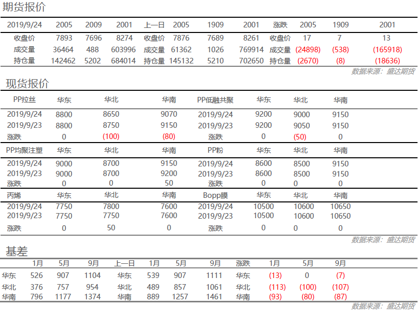 丙烯:今日丙烯市场价格维稳运行,消息面指引暂不明朗,个别丙烯生产企业受制于自身库存及指标情况,报盘涨跌均存,市场高低成交价差拉大。粒料:今日国内粒料市场价格小幅整理,幅度在50元/吨左右,期货震荡对市场无明显指引,下游对高价货源接受能力有限,部分高价小幅回落,今日库存小幅下降。粉料:上游丙烯维稳于宁,聚丙烯期货行情弱势震荡,但部分地区现货供应稍显紧张,粉料价格稳中整理为主。