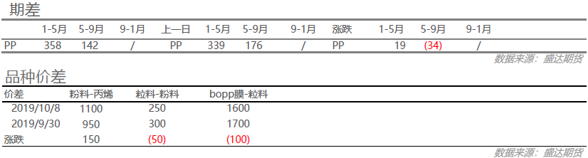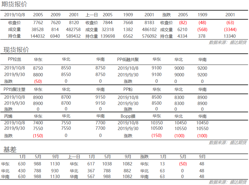 丙烯:今日丙烯市场价格维稳运行,节后丙烯上下游装置波动偏多,聚丙烯期货价格下行震荡,市场走势暂不明朗。丙烯炼厂节中出货情况尚可,节后排库压力不大。粒料:今日国内粒料市场价格重心小幅下移,国庆小长假结束后,石化库存增加28万吨至88.5万吨,库存压力较大,期货开盘弱势下行,场内现货报价顺势下行。粉料:聚丙烯期货弱势下行,但假期结束下游工厂适量补货,粉料价格稳中弱势整理。