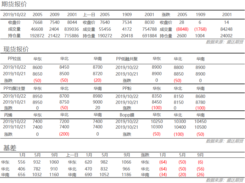 丙烯:今日丙烯市场价格维稳运行,国际原油以及聚丙烯期货价格走势较弱,炼厂出货意愿强烈,下游工厂采购积极性提高。粒料:今日国内粒料市场价格重心小幅下移,石化部分区域下调出厂价,成本面支撑减弱;主力期货低开弱势震荡,打压下游寻货心态,场内商家延续下调现货报价,下游刚需采购为主。粉料:聚丙烯期货延续跌势,市场信心不足,粉料价格延续跌势。粉料利润空间尚可,与粒料的价差也逐渐修复,粉料低价优势有所体现。
