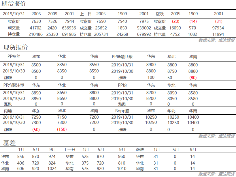 丙烯:今日丙烯市场价格跌幅扩大,国际原油及聚丙烯期货价格延续跌势,看空预期下,下游工厂买盘力度不佳,炼厂出货压力普遍上升,让利排库积极性相对较高。粒料:今日国内粒料市场价格低位整理为主,场内部分价格仍有下调,幅度在50元/吨左右,期货区间震荡对后市走势指向不明,今日价格仍存在下滑态势,贸易商多随行积极出货。粉料:上游丙烯单体跌幅扩大,午间聚丙烯期货行情不佳,但现阶段粉粒料价差尚可,下游工厂按需采购为主,今日粉料价格稳中整理为主。