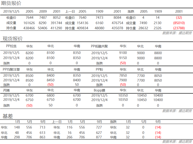 丙烯:今日丙烯市场价格继续下行,国际原油岁大涨,但丙烯市场需求不佳。粒料:今日国内粒料市场小幅整理,期货下滑压制市场情绪,加之下游业者接盘能力有限,场内交投氛围平平,但石化厂价今日仍有部分补涨,成本端尚有支撑。粉料:上游丙烯单体延续跌势,成本面支撑不足,利空业者心态,今日粉料价格整理为主。
