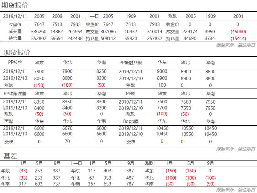 丙烯:今日丙烯市场价格维稳运行,山东地区雾霾天气持续,区外货源流入受阻,下游工厂多以刚需为主,生产企业出货放缓,库存压力略有上升。粒料:今日国内粒料市场延续弱调,拉丝主流价格下跌50-100元/吨左右。期货连续下挫压制场内心态,拖累拉丝现货价格同步走低,加之石化下调部分出厂价格,成本端有所松动粉料:上游丙烯单体价格稳中整理,成本面变化不大,但聚丙烯期货行情较弱,利空市场心态,今日粉料价格小幅走低。