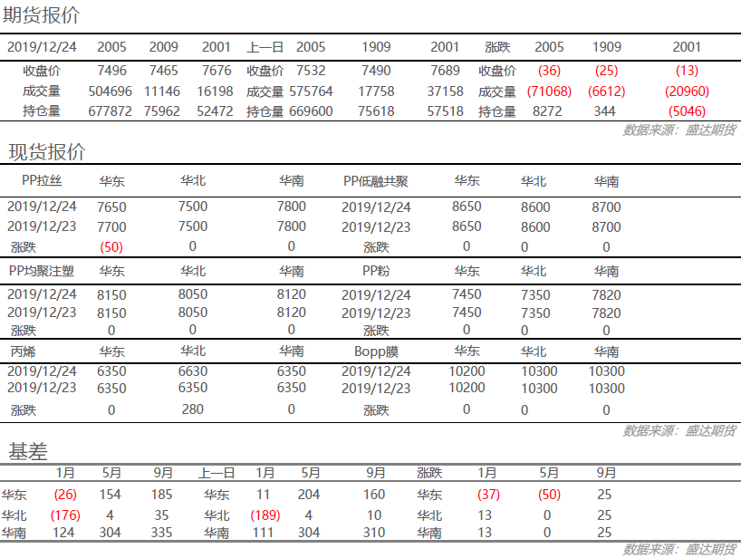 丙烯:今日丙烯市场价格维稳运行,下游工厂延续刚需,部分生产厂家企业根据自身出货情况报盘微调。粒料:今日国内粒料市场弱势运行为主,部分价格下调50-100元/吨。PP期货主力合约低开低位运行打击场内业者信心,贸易商让利出货,报价继续走低。下游终端观望心态较浓,刚需采购为主。粉料:今日粉料价格稳中弱势整理,聚丙烯期货行情大幅震荡,拖累市场心态,厂家维稳为主。