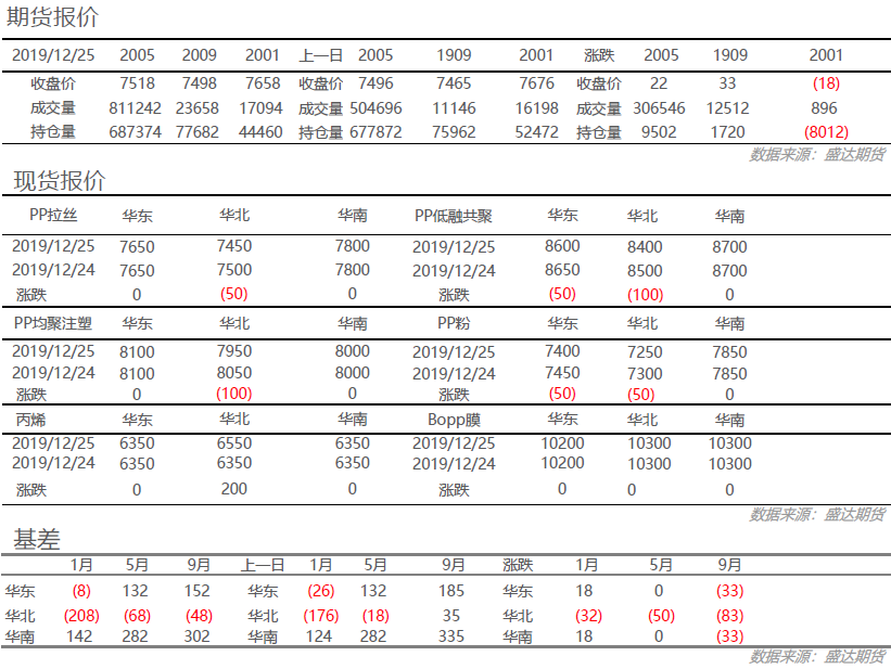 丙烯:今日丙烯市场价格重心小幅下移,丙烯市场多空消息混杂,但厉害影响有限,生产企业出货压力偏大,厂家让利出货为主,市场价格走低。粒料:今日国内粒料市场弱势运行为主,期货今日低开震荡,午后虽振幅拉宽,但对市场影响有限。华北地区因石化厂价下调,拉丝报价出现明显跟跌,下游终端看空心态占据上风。粉料:今日粉料价格走弱,下游采购性降低,粉料近日出货不畅。