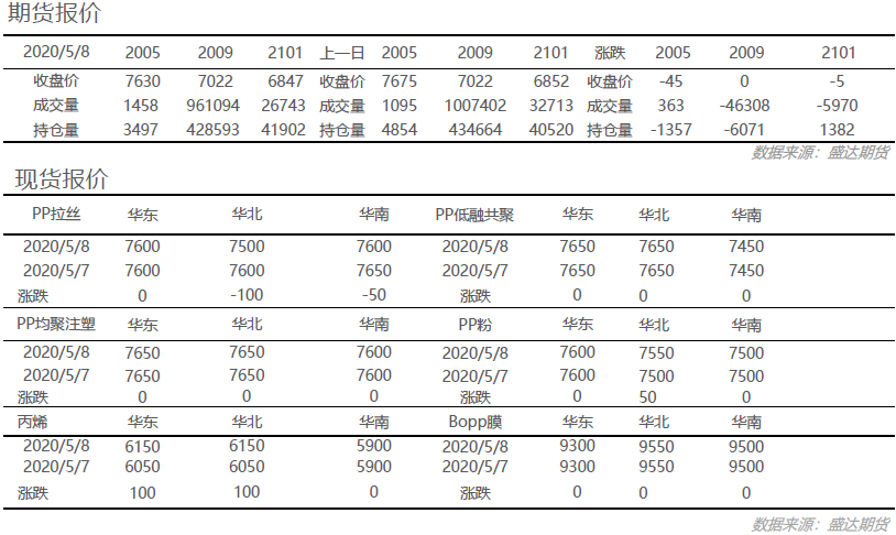 昨日聚丙烯低开低走,05合约收于7630,跌45,09合约收于7022,与前一日持平;现货变动不大, 维稳为主;05合约华东基差收于-30,山东基差收于-130,09合约华东基差收于578,山东收于478,05-09月差收于,068,09-01月差收于175,基差、月差纷纷走强,近远月基差的分离,以及59月差的持续走强都反映了当前现实强、预期弱的局面。