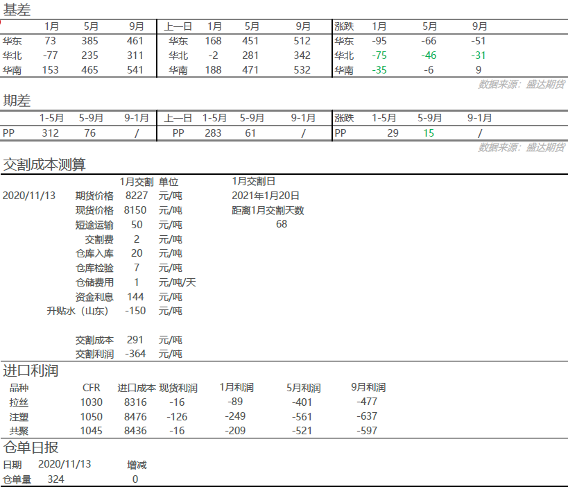 后市展望 周内PP波动幅度较大,两油库存震荡下跌,煤化工库存有所累积,贸易商库存走低,而港口库存小幅增加;下游来看,BOPP膜企库存处于低位,排产周期长,下游催货紧,膜企交货压力大,库存基本没有或维持低位运行;塑编原材料库存处于低位,原料先涨后跌,下游适量补货。 目前矛盾点在于投产预期与现实需求较强之间,新装置投产有出现延期的可能,而需求端还没有看到走弱的痕迹,近期预计盘面仍将保持在高位震荡。 四季度LPG在国内丙烷以及丁烷的需求转暖,以及高利润不可持续背景下,趋势做空PDH利润。 行情分析 昨日聚丙烯高开高走,01合约收于8227,涨145元/吨,05合约收于7915,涨116元/吨;现货价格调高20-100元/吨左右,共聚-拉丝价差收于120元/吨,01合约华东基差收于73元/吨,山东基差收于-77元/吨,基差大幅走弱,01-05月差收于312元/吨。 市场资讯 2、巨正源一线(30万吨/年)11月8日临时停车,开车时间待定。