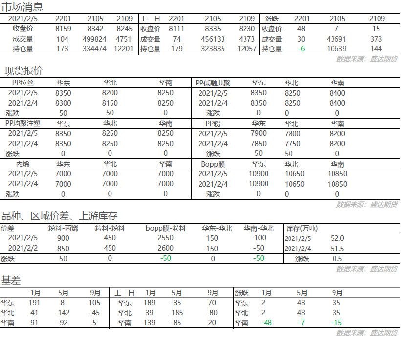 昨日聚丙烯盘面价格继续走高,05合约收于8342,涨7元/吨,09合约收于8245,涨15元/吨,现货价格跟随盘面上涨,幅度在50元/吨左右,共聚-拉丝价差收于0元/吨,05合约华东基差收于8元/吨,山东基差收于-142元/吨,05-09月差收于97元/吨,09-01月差收于86元/吨。