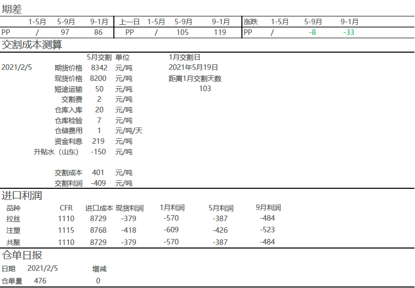 近期下游的补库带来了产业链明显的由中上游向下游转移的现象,但下游的补库并没有伴随着订单提升,所以此次补货更多的是基于节后人员以及物流回归的不确定性,一定程度透支了后期需求。PP此前价格被低估的问题已经明显修复(利润、进口价差、拉丝-丙烯价差),因此不建议PP追多。