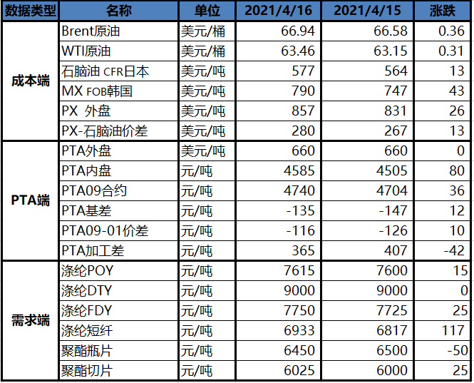 注2:PTA期货价格为当日收盘价
