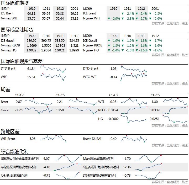 9月6日当周EIA原油库存变动实际公布降低691.20万桶,预期降低265.5万桶,前值降低477.1万桶。汽油库存实际公布降低68.2万桶,预期降低85.7万桶,前值降低239.6万桶;精炼油库存实际公布增长270.4万桶,预期降低50.9万桶,前值降低253.8万桶。上周美国国内原油产量维持1240万桶/日。能源研究公司RystadEnergy:美国今年美国页岩油产量将增加130万桶/日,12月石油产量将触及1290万桶/日,2020年底前将为1400万桶/日。