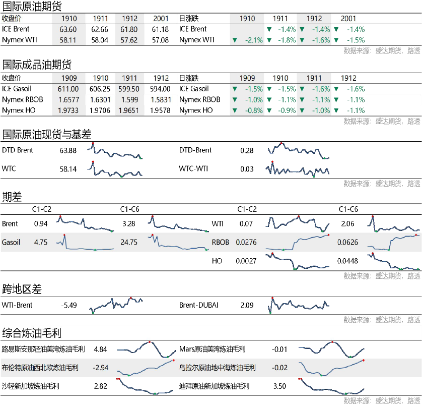 市场信息消息简述:EIA报告:除却战略储备的商业原油库存增加105.8万桶至4.171亿桶,增加0.3%。上周美国国内原油产量减少0万桶至1240万桶/日。除却战略储备的商业原油上周进口705万桶/日,较前一周增加32.5万桶/日。美国上周原油出口减少12万桶/日至317.5万桶/日。沙特国防部:沙特展示了导弹和无人机,显示伊朗应为石油袭击负责。对沙特的袭击毫无疑问是由伊朗资助的。实施袭击的巡航导弹为“YaAli”巡航导弹,为伊朗革命卫队使用的武器。袭击共使用了25架无人机及巡航导弹。袭击不可能从也门方面发动。胡塞武装宣称负责是为了掩盖伊朗的参与。沙特阿美回收的所有军事部件都指向伊朗。仍在就精确的发射地点进行调查。美联储公布最新的9月利率决议,美联储如期降息25基点,利率调整至1.75-2.00%,符合预期。从本次美联储决议声明上看,美联储措辞似乎是鸽派不及预期,美联储在对经济的描述上并没有市场想象的那么糟糕,且市场认为在本次降息之后,美联储年内再度降息希望渺茫。周二沙特官方证实之前被袭而缺失的产能将在月底恢复,这和我们之前预判的一至。接下来,中长期空头思路不改,但短线需关注美国伊朗关系,这次沙特石油设施被袭沙特国内或者是美国国内部分人员都想将责任往伊朗方向推,我们的观点是:所有的都是极限博弈的手段,伊朗不太可能会亲自动手。此外,就此次沙特石油设施被袭,沙特或将采取的“报复手段”也需关注,不论是胡塞武装或伊朗。